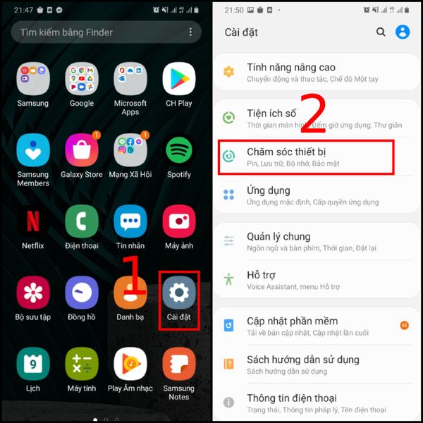 Bước 1: Vào “Cài đặt” trên màn hình -> Chọn mục “Chăm sóc thiết bị”.