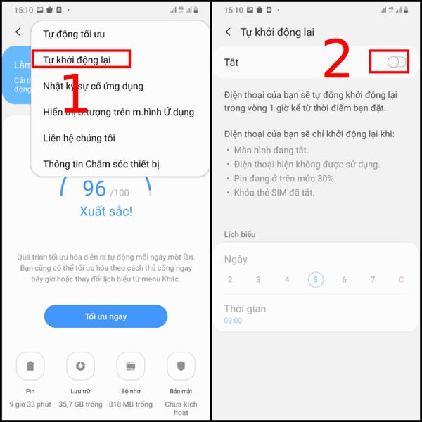 Đây là một tính năng cho phép điện thoại tự động khởi động lại vào một thời gian nhất định để tối ưu hoá hiệu suất. Tuy nhiên, nếu tùy chọn này bị lỗi, nó có thể khiến điện thoại khởi động lại liên tục. Để tắt bạn thức hiện các bước như sau: