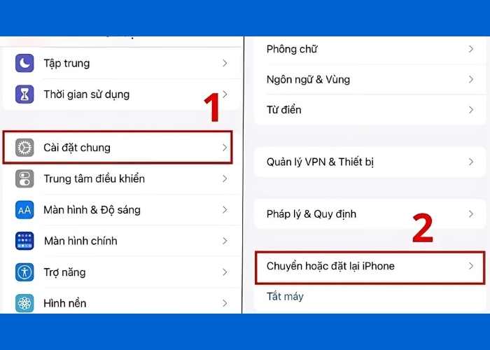 Bước 1: Nhấn vào ứng dụng “Cài đặt” trên iPhone và chọn mục “Cài đặt chung” rồi chọn tiếp “Chuyển hoặc đặt lại iPhone”.