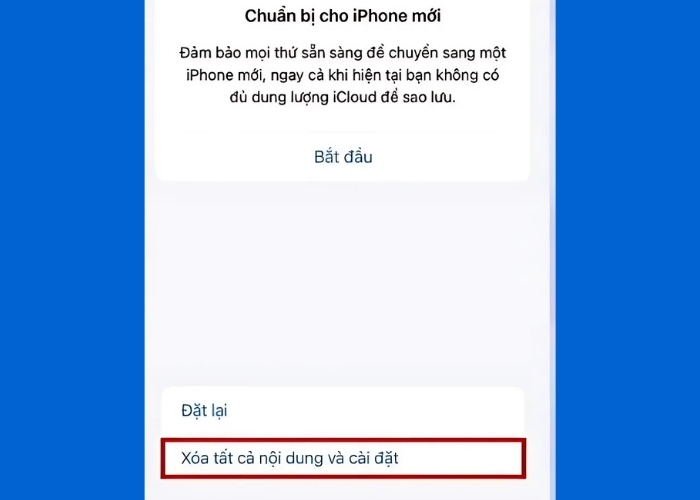 Bước 2: Lựa chọn lệnh “Xoá tất cả nội dung và cài đặt” để xác nhận lại yêu cầu đặt lại điện thoại.