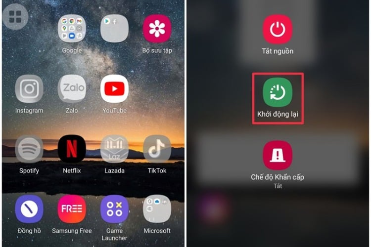 Nhấn giữ nút "Nguồn" sau đó chọn "Khởi động lại" để thoát