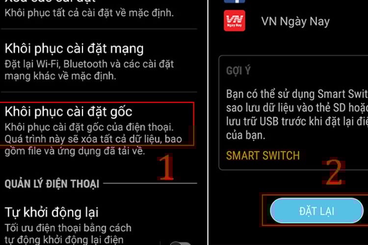 Bước 2: Nhấn vào "Đặt lại" tiếp theo chọn "Khôi phục cài đặt gốc".