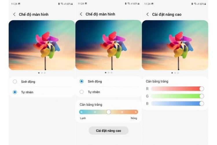Bước 2: Trong phần Chế độ màn hình nhấn chọn Cân bằng trắng để điều chỉnh nó về mức trung bình. Sau đó, bạn có thể vào phần Cài đặt nâng cao để điều chỉnh thêm cho đến khi cảm thấy phù hợp với mắt.