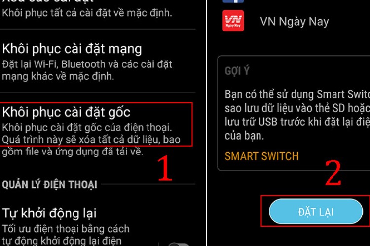 Bước 2: Trong mục “Đặt lại” chọn “Khôi phục cài đặt gốc”. Sau đó, chọn “Đặt lại” để xác nhận việc khôi phục cài đặt gốc.