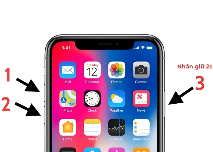 Bước 3: Nhấn tổ hợp phím “Tăng âm lượng” + “Giảm âm lượng” + “Giữ nút nguồn 2s” để khởi động lại thiết bị.