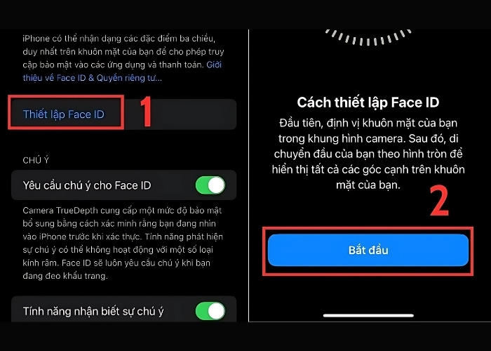 Bước 2: Nhấn chọn “Thiết lập Face ID” và chọn “Bắt đầu” để đặt lại khuôn mặt mới.