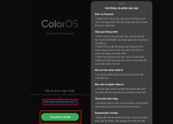 Nhấn chọn Tải xuống và cài đặt để cập nhật hệ điều hành OPPO mới