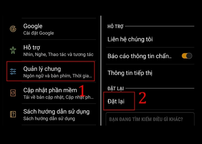 Khôi phục cài đặt gốc: Đầu tiên bạn cần sao lưu dữ liệu quan trọng, rồi vào phần Cài đặt, tiếp theo nhấn Quản lý chung, ấn Đặt lại và chọn Khôi phục cài đặt gốc. Cách này sẽ xóa xung đột phần mềm, đưa máy S23 Ultra bị sọc màn hình về trạng thái ban đầu.