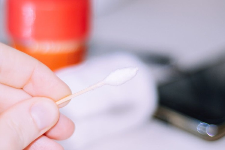 Sử dụng một cây tăm bông sạch để loại bỏ bụi bẩn trong cổng sạc