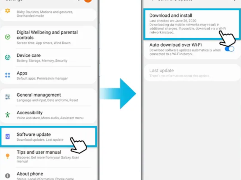 Thực hiện bằng cách vào Cài đặt đi đến Cập nhật phần mềm và Tải về và cài đặt. Quá trình này sẽ loại bỏ các lỗi phần mềm còn tồn đọng và giúp điện thoại hoạt động ổn định hơn.