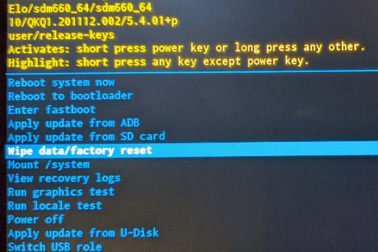 Bước 2: Dùng phím Giảm âm lượng để di chuyển đến mục "Wipe data/factory reset" sau đó nhấn nút Nguồn để chọn.