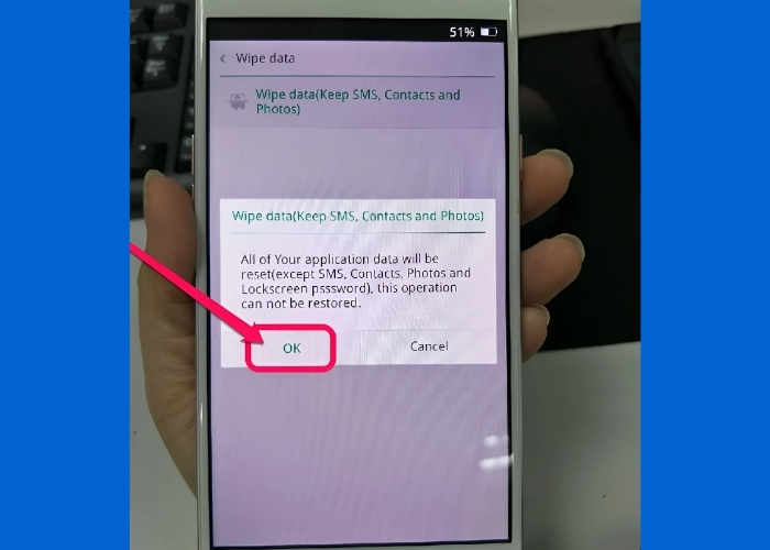 Bước 4: Tuy nhiên, nếu chỉ thấy tuỳ chọn “Wipe data” thì chọn “Wipe application data” chọn chọn “OK”, bước này sẽ giúp bạn giữ lại toàn bộ danh bạ và tin nhắn SMS.