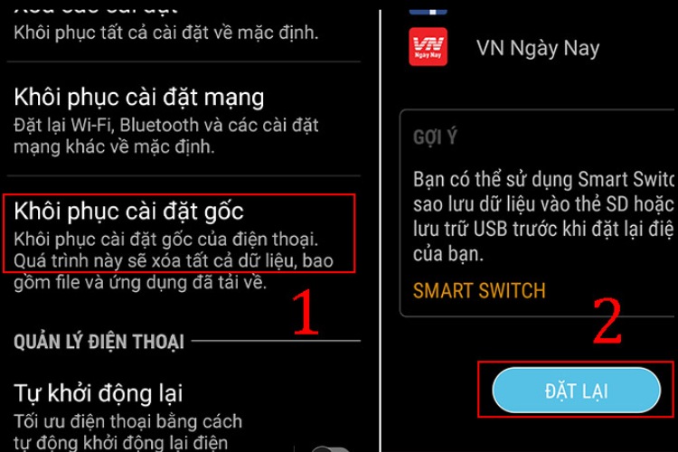 Chọn “Khôi phục cài đặt gốc” > Nhấn “Đặt lại”