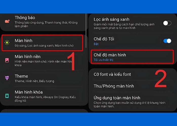Bước 1: Vào “Cài đặt” rồi chọn “Màn hình”, vào tiếp mục “Chế độ màn hình”.