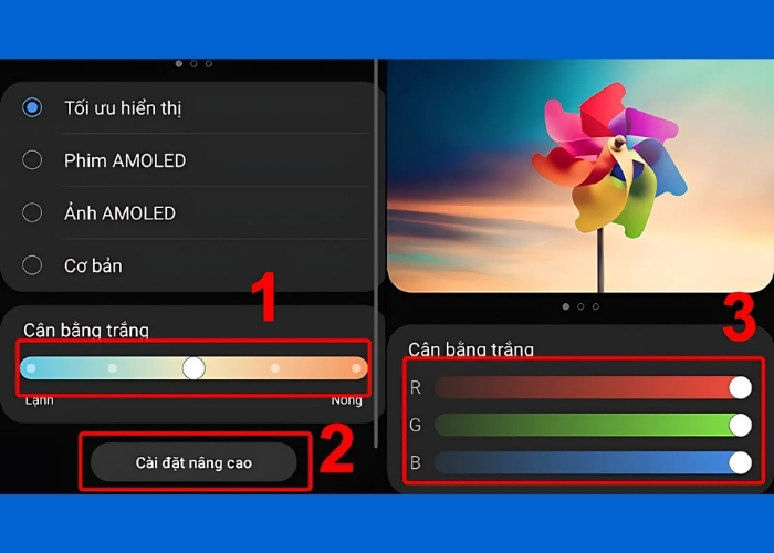 Bước 2: Điều chỉnh là phần “Cân bằng trắng” ở mức trung bình rồi vào phần “Cài đặt nâng cao” để cân chỉnh lại màu sắc sao cho phù hợp với sở thích và nhu cầu của bản thân.