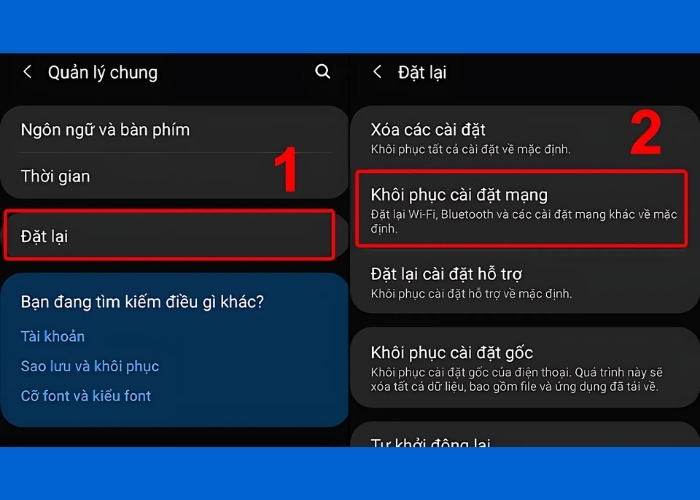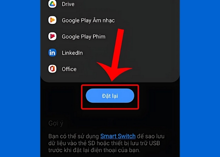 Bước 2: Nhấn vào mục “Đặt lại” rồi chọn “Khôi phục cài đặt gốc”.