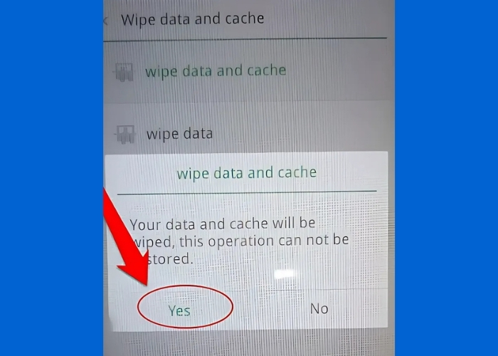 Bước 3: Khi tuỳ chọn “Wipe data and cache” xuất hiện, hãy xoá dữ liệu bằng cách nhấn “Yes”.