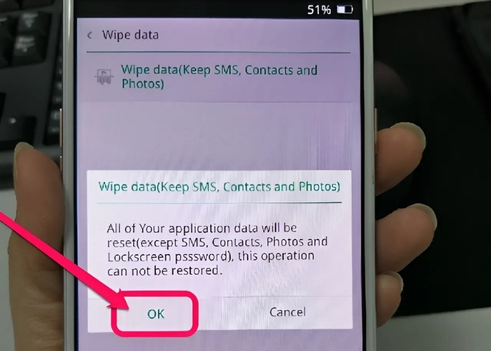 Bước 4: Nếu chỉ thấy tuỳ chọn “Wipe data”, hãy chọn “Wipe application data” và nhấn “OK”, cách này sẽ giúp bạn giữ lại tất cả danh bạ và tin nhắn SMS.