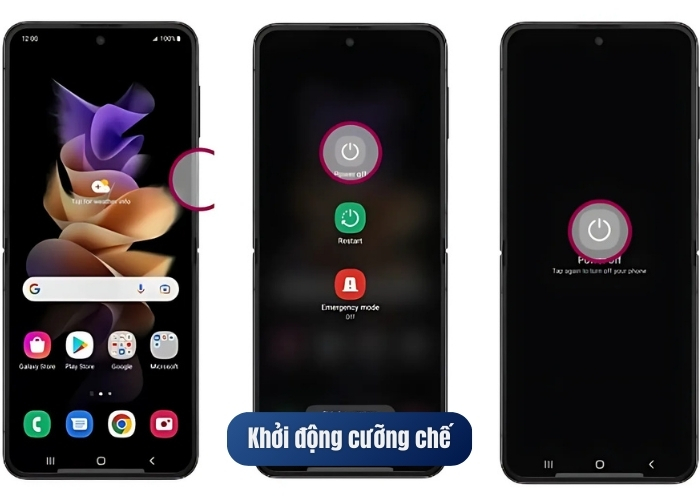 Thực hiện khởi động cưỡng chế điện thoại Samsung Z Flip4 bằng cách nhấn và giữ nút “Nguồn” cùng nút “Tăng/giảm âm lượng” từ 10-15 giây để máy có thể khởi động lại. >>> Xem thêm: Khôi Phục Cài Đặt Gốc Điện Thoại Android