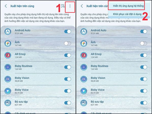 Bước 3: Bấm vào biểu tượng ba chấm dọc > Chọn Hiển thị ứng dụng hệ thống.