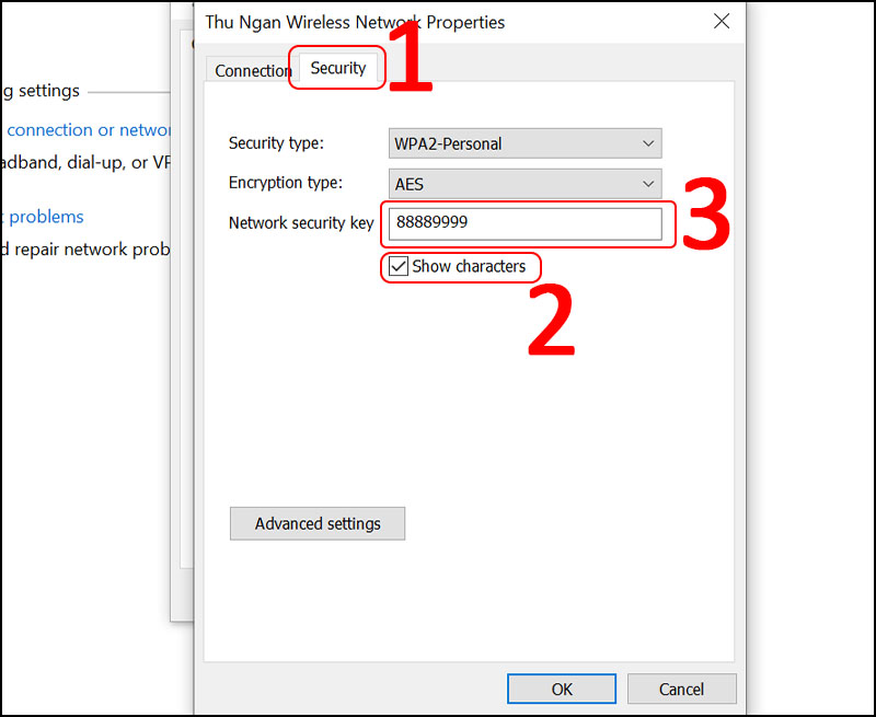 Bước 4: Chuyển sang tab "Security" và đánh dấu vào ô "Show characters" để hiển thị mật khẩu Wi-Fi đang kết nối.