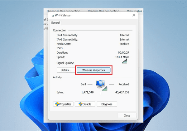 Bước 3: Trong cửa sổ "Wi-Fi Status", chọn "Wireless Properties".