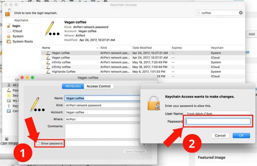 Bước 4: Nhấp đúp vào tên mạng Wi-Fi và chọn "Show password". Bạn sẽ cần nhập mật khẩu quản trị viên của Mac để xem mật khẩu Wi-Fi.