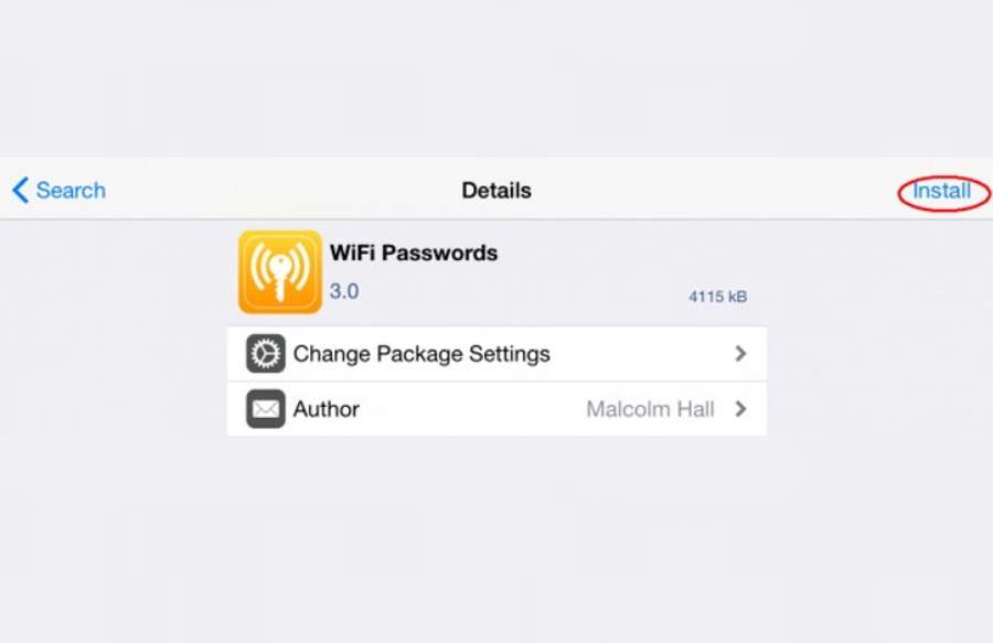 Bước 1: Để xem mật khẩu wifi iPhone đã jailbreak, bạn vào Cydia. Gõ vào ô Tìm kiếm Wifi Passwords và cài đặt ứng dụng bằng cách nhấn chọn Install. Đây là ứng dụng giúp bạn xem pass Wifi trên iPhone hoàn toàn miễn phí.