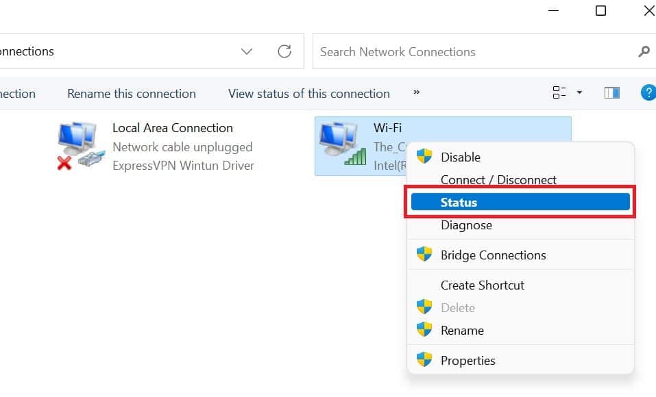 Bước 2: Chọn "Change adapter options" và nhấp chuột phải vào kết nối Wi-Fi đang hoạt động, sau đó chọn "Status".