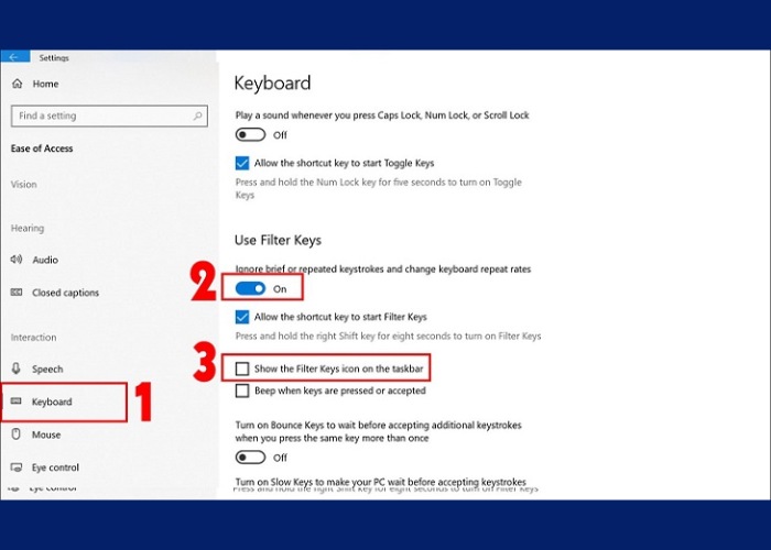 Bước 4: Ở phần "Use Filter Keys", bật chức năng "Ignore brief or repeated keystrokes and change keyboard repeat rates" lên.