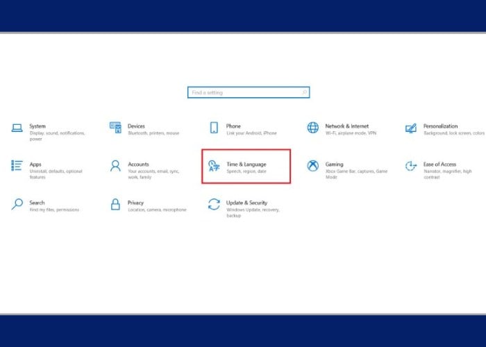 Chọn mục "Time & Language" (Thời gian và ngôn ngữ)