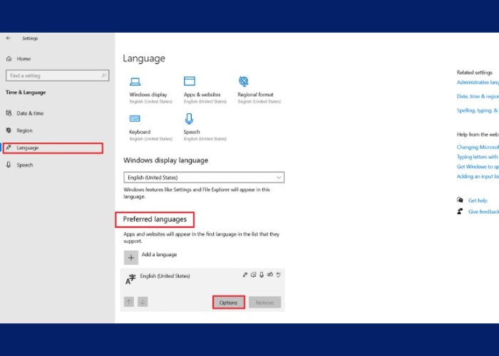 Tiếp tục chọn "Language" sau đó trong phần "Preferred languages" nhấn "Options"