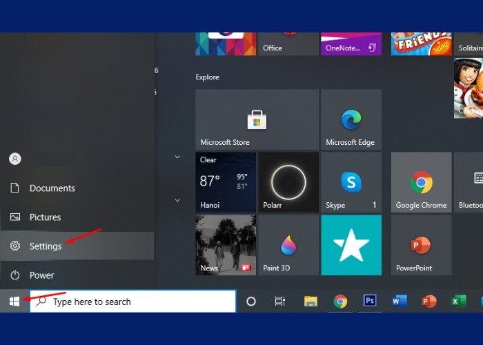 Bước 1: Truy cập vào mục Start Menu tiếp tục click chuột chọn "Settings".
