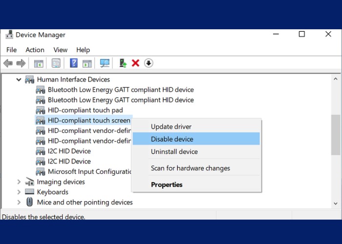 Trong Device Manager bạn di chuyển xuống phía dưới đến mục Human Interface Devices sau đó chọn HID-compliant touch screen. Ở đây, nhấp chuột phải chọn Enable để bật tính năng cảm ứng màn hình trên thiết bị.