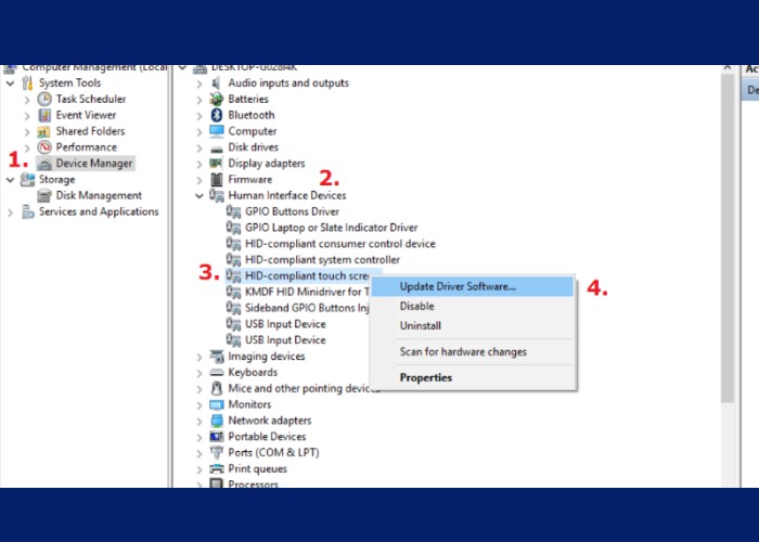 Quá trình bật cảm ứng màn hình laptop liên quan đến phần cứng máy tính. Do đó, khi gặp sự cố màn hình cảm ứng có thể có liên quan đến CPU. Cập nhật driver cho laptop là một phương pháp đơn giản để khắc phục vấn đề này. Bạn truy cập vào Device Manager như hướng dẫn trước đó sau đó nhấp chuột phải vào HID compliant touch screen và chọn Update Driver Software.