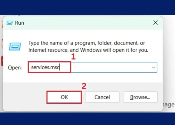 Nhập lệnh "services.msc" vào ô trống và nhấn OK