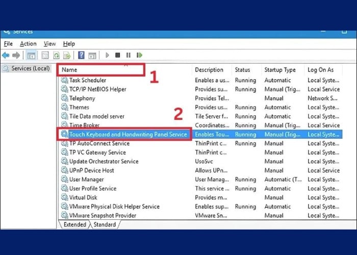 Bước 2: Trong cửa sổ Menu Services, chọn cột "Name" sau đó cuộn xuống cho đến khi bạn thấy tùy chọn "Touch Keyboard and Handwriting Panel Service". Tiếp theo, nhấn đúp chuột vào tùy chọn này.