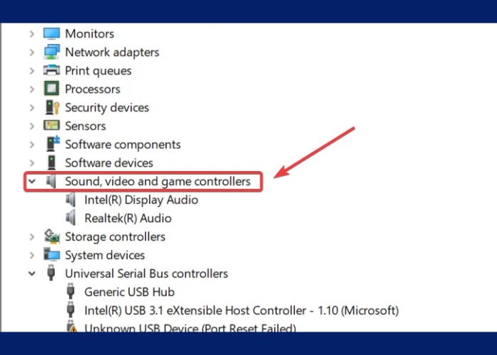 Lưu ý: Nếu bạn thấy biểu tượng cảnh báo màu vàng bên cạnh tên của bộ điều khiển âm thanh, có thể driver cho bộ điều khiển đó đã bị hỏng hoặc đã bị gỡ cài đặt.