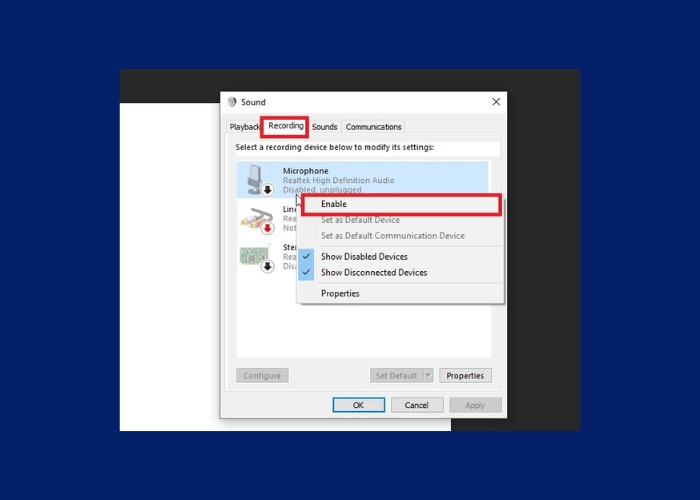Bước 2: Trong cửa sổ mới mở, chọn tab “Recording” sau đó chọn Microphone và nhấp vào “Enable”.