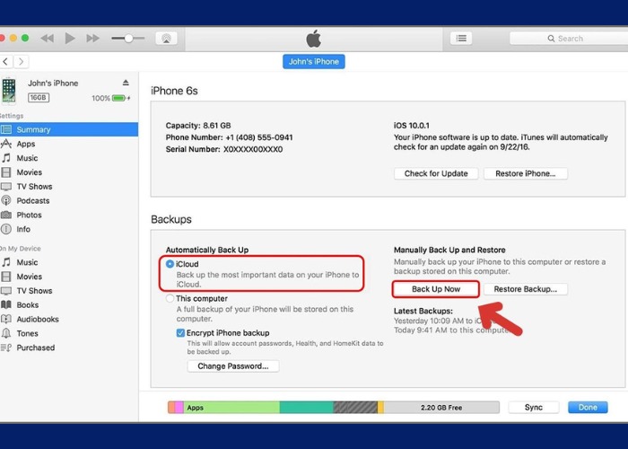 Nhấn vào “Back Up Now” để sao lưu dữ liệu của thiết bị lên iCloud