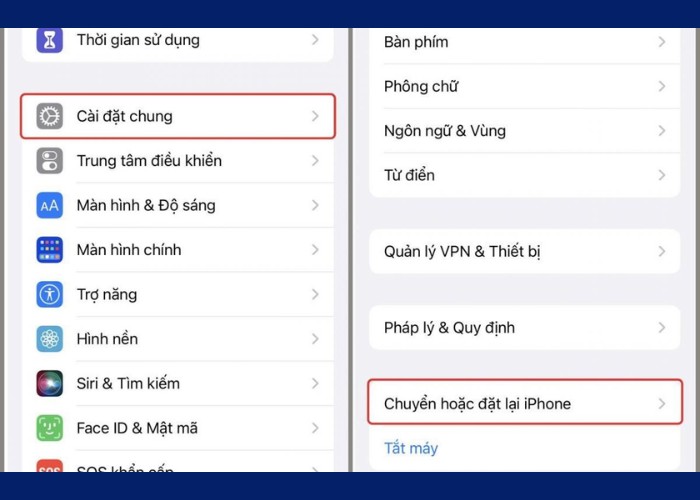 Bước 1: Truy cập vào "Cài đặt", sau đó chọn "Cài đặt chung" và tiếp theo là "Chuyển hoặc đặt lại iPhone".