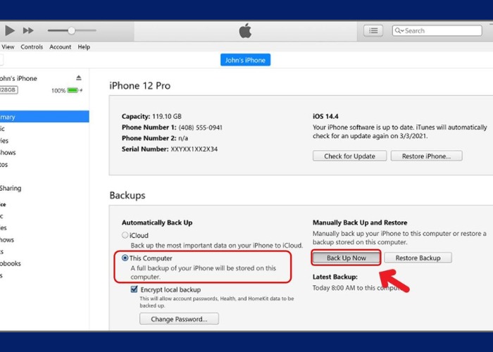 Bước 2: Trong iTunes, chọn vị trí lưu trữ là “This Computer” sau đó nhấn “Back Up Now” đợi cho quá trình sao lưu hoàn tất.