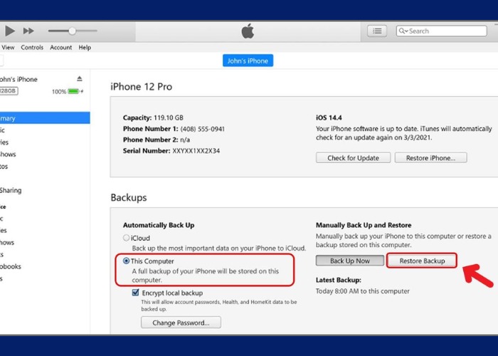 Bước 4: Sau đó, trong iTunes, chọn “Restore Backup” tìm bản sao lưu mà bạn đã thực hiện từ iPhone cũ để khôi phục.
