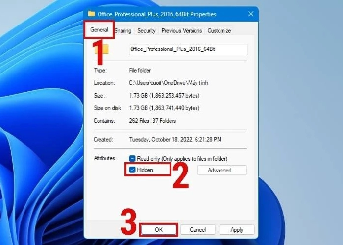 Bước 2: Tại Properties, chọn General > Tích chọn Hidden để ẩn icon và nhấn Ok để hoàn tất thay đổi.
