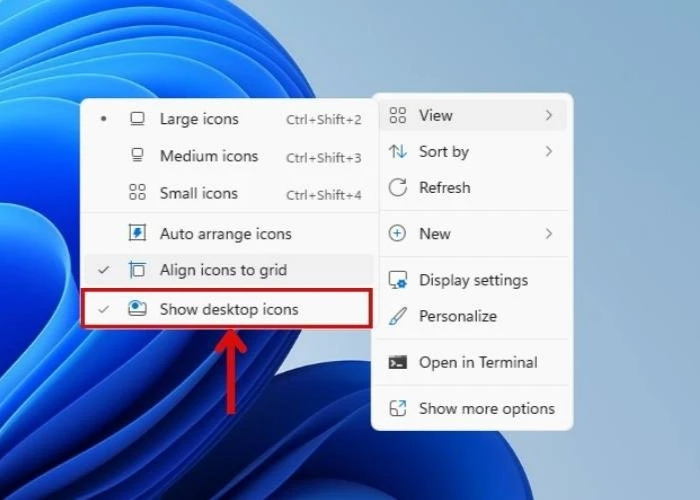 Nhấp chọn mục Show Desktop icons để bỏ dấu tích