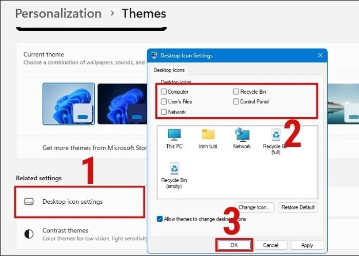 Bước 3: Tại Personalization, chọn Themes > chọn tiếp Desktop icon settings.