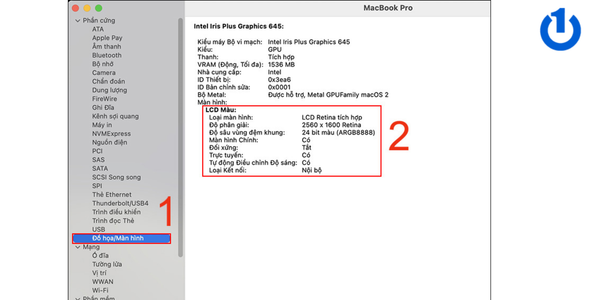Bước 4: Tại đây tìm và chọn “Đồ họa/ Màn hình” .Tại đây sẽ xuất hiện tất tần tật về thông tin của màn hình Macbook để bạn có thể nắm rõ về “Loại màn hình”, “Độ phân giải”, “Độ sâu vùng đệm khung”,....