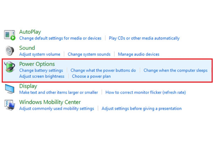 Bước 2: Chọn “Hardware and Sound”, tiếp theo sau đó nhấp vào “Power Options”.