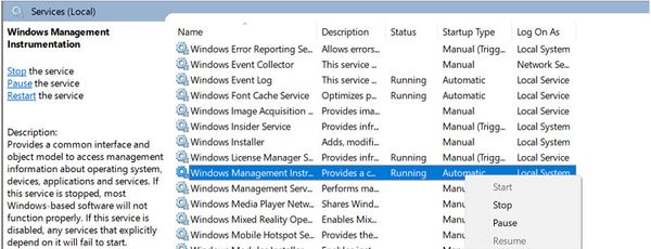 Tìm "Windows Management Instrumentation" -> "Dừng lại" (Stop)