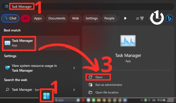 Bước 1: Tìm kiếm và mở Task Manager tại thanh công cụ tìm kiếm của Windows.